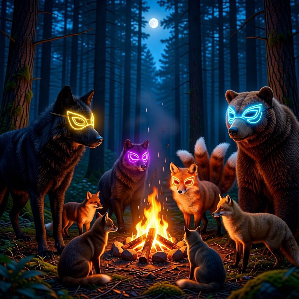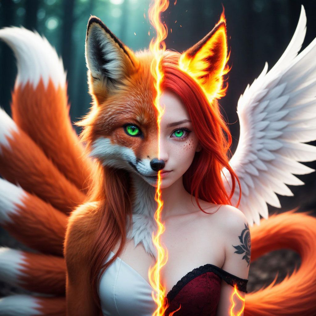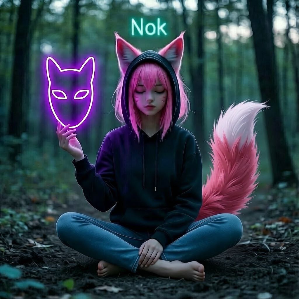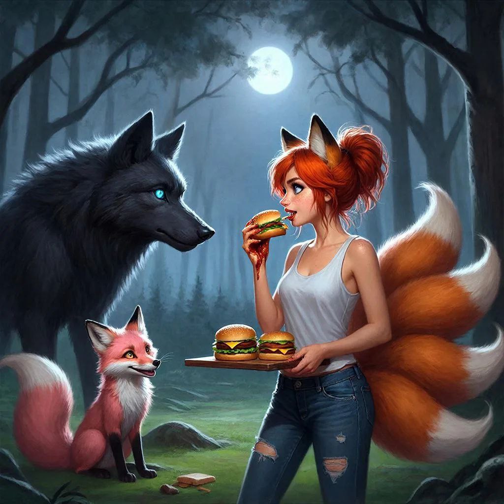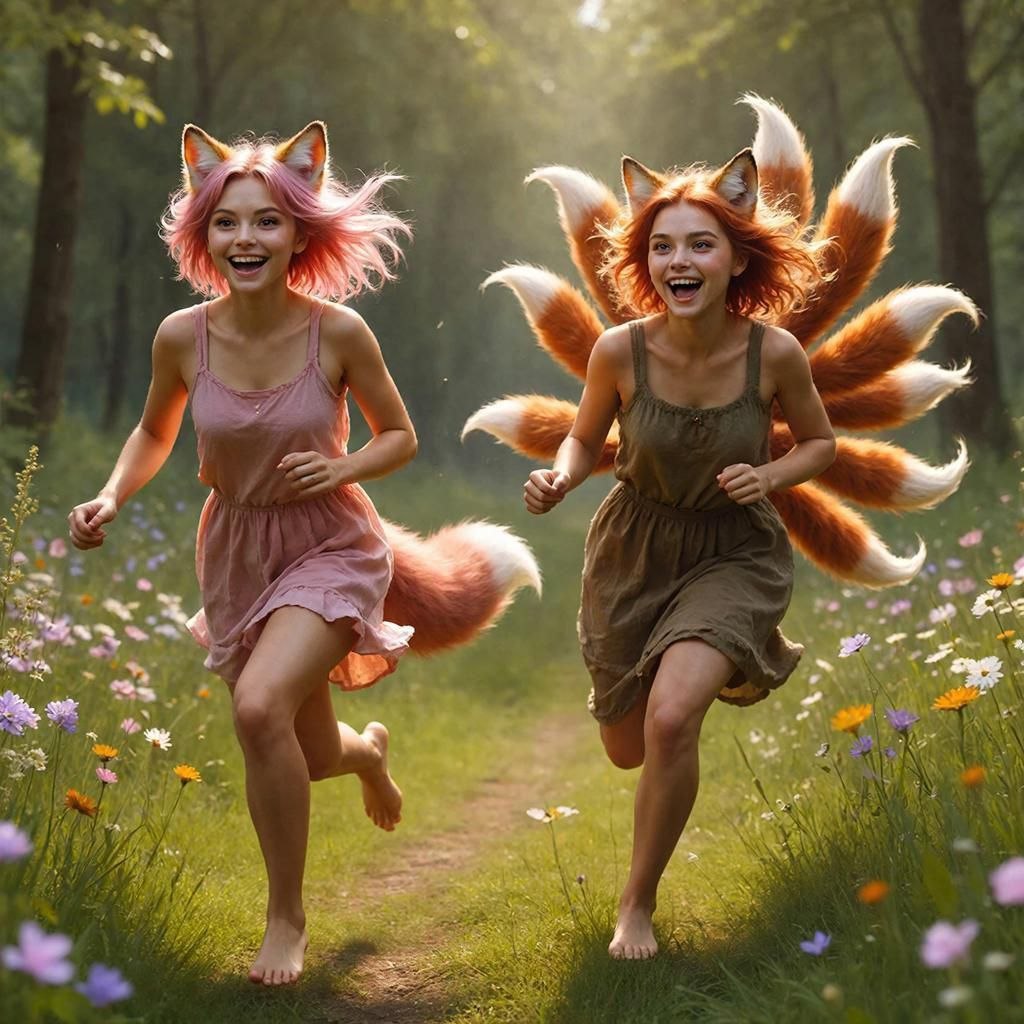 Бег превратился в настоящую погоню. Нок, несмотря на свою казалось бы минимальную физическую силу, двигалась с невероятной скоростью, словно её ноги сами несли её вперёд. Дюна, в свою очередь, демонстрировала всю свою мощь и грацию, её девять хвостов развевались за ней, подобно флагу. Они петляли между деревьями, прыгали через упавшие стволы, их смех эхом разносился по лесу, смешиваясь с шелестом листвы. Этот момент чистого, беспечного веселья был для них редким подарком в этом суровом мире.