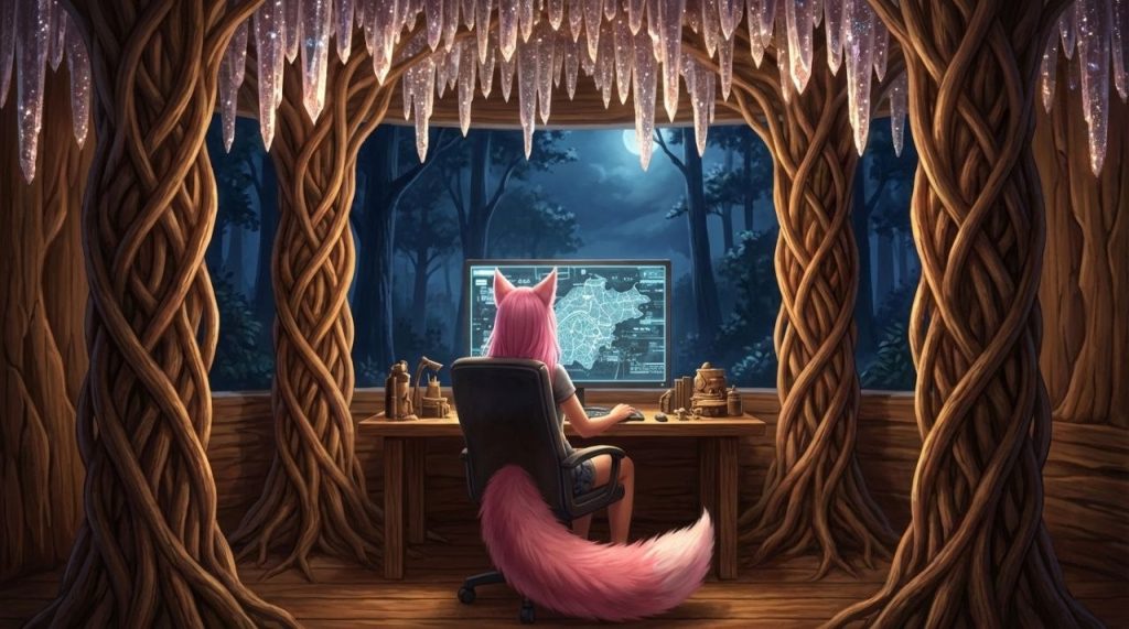 Внутри форпоста царила оживлённая, но организованная суета. Воины готовились к очередным вылазкам, проверяли снаряжение, обсуждали тактику. Нок, поприветствовав несколько знакомых лиц, интуитивно направилась к своему рабочему месту – небольшой, но уютной нише, оборудованной для медитации и анализа полученных данных, и неоновой табличкой NOK. («Так вот о чём говорили ребята. Следовательно, места в альянсе ограничены не просто так»). Руми удобно расположилась в кресле перед экраном, на котором то и дело происходили корректировки у кого-то из клана. Ей предстояло сверить отчёты о последних стычках с враждебными охотниками, выявить закономерности в их действиях и, возможно, предложить новые стратегии противодействия.